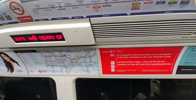 Do 18 listopada pasażerowie londyńskiego metra mogą czytać po angielsku fragmenty Przesłania Pana Cogito Zbigniewa Herberta, Oktostychów Jarosława Marka Rymkiewicza, a także nowego przekładu Pana Tadeusza. Przy okazji akcji, zorganizowanej przez Instytut Książki przy wsparciu Ambasady RP w Londynie, uruchomiono także stronę BooksFromPoland.pl, na której są informacje o przekładach literatury polskiej na język angielski z ostatnich lat.
