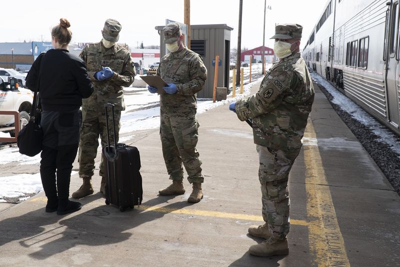 Na zdjęciu: Gwardia Narodowa prowadzi kontrolę podróżnych na stacji kolejowej w stanie Montana.