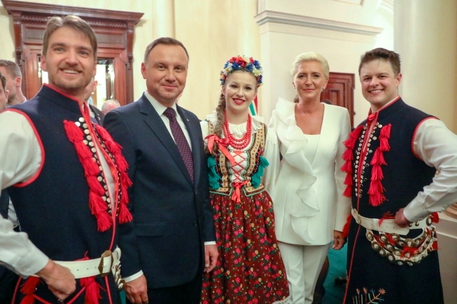 Na zdjęciu: Prezydent Polski Andrzej Duda z małżonką Agatą Kornhauser-Dudą pozują do zdjęcia z przedstawicielami Polonii