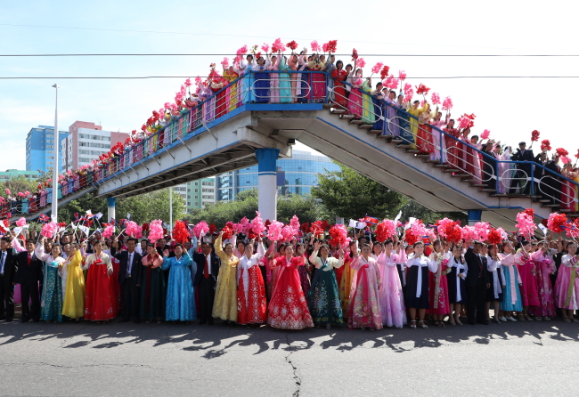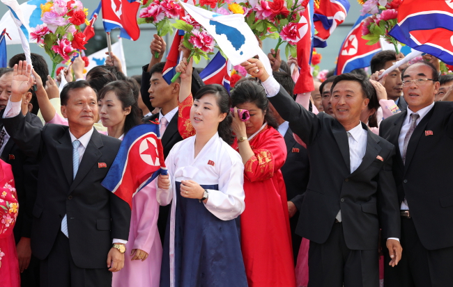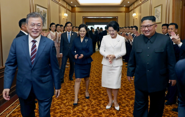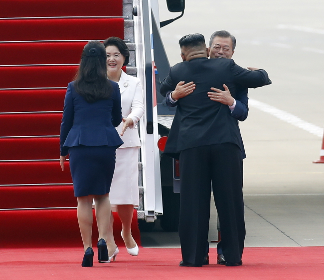 Kim i Mun uścisnęli się na powitanie, gdy we wtorek rano pierwsza para Korei Płd. wraz z ponad 100-osobową delegacją wysiadła z samolotu na lotnisku w Pjongjangu. Kimowi towarzyszyła m.in. jego żona Ri Son Dziu, siostra – Kim Jo Dzong oraz wysokiej rangi urzędnicy państwowi. Po ceremonii powitalnej z udziałem gwardii honorowej i setek osób z kwiatami i flagami Kim i Mun opuścili lotnisko osobno. Później jechali jednak razem ulicami Pjongjangu limuzyną z otwartym dachem, machając do dziesiątków tysięcy ludzi, wiwatujących i skandujących hasło: „Zjednoczenie ojczyzny” – podała agencja Yonhap.