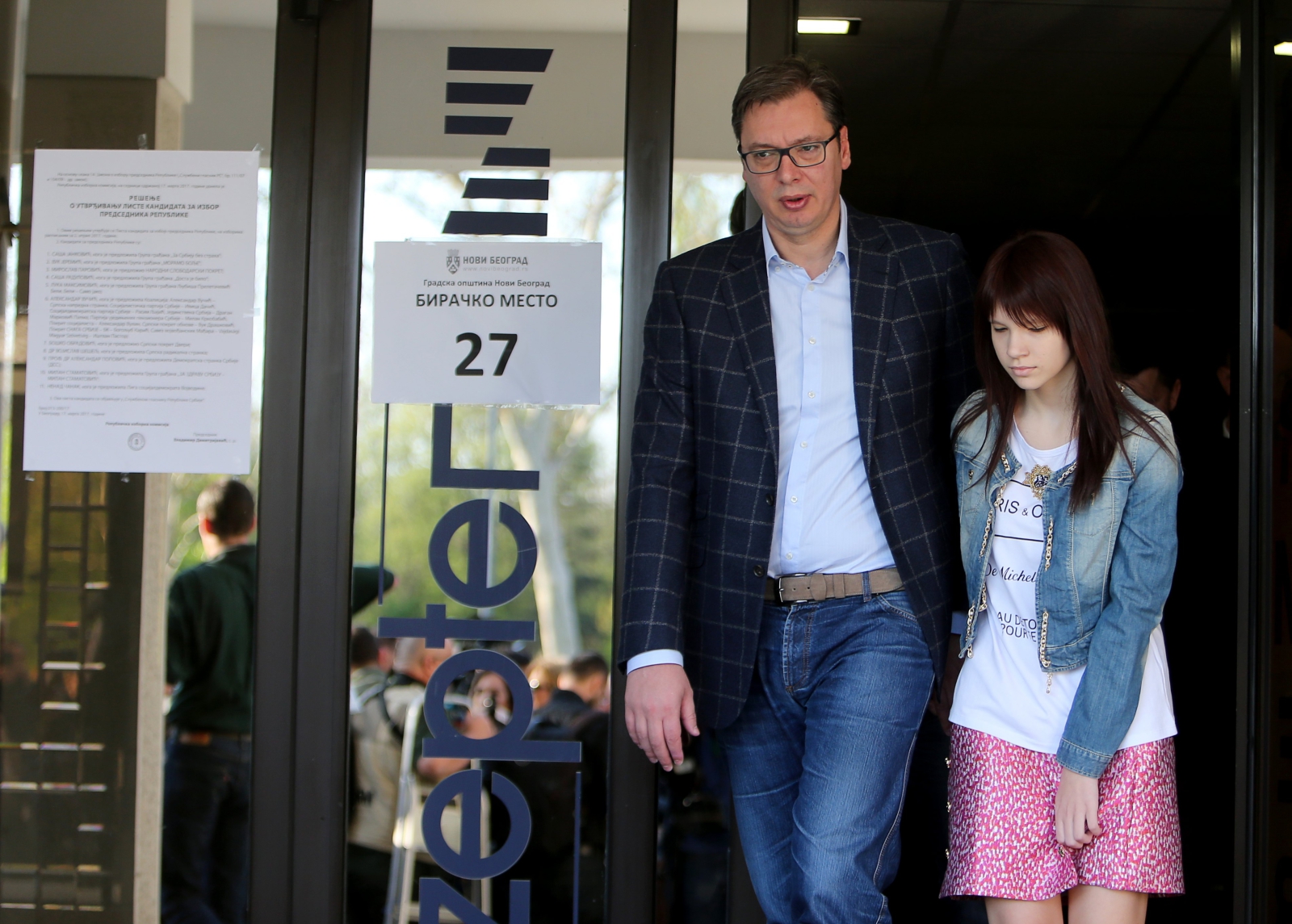 Na zdjęciu: Aleksandar Vuczić w towarzystwie swojej córki opuszcza lokal wyboczy w Belgradzie.