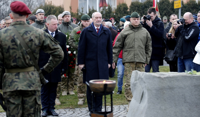 Na zdjęciu : Minister obrony narodowej Antoni Macierewicz w Dębowcu na Śląsku Cieszyńskim podczas weekendowych uroczystości upamiętniających pierwszy zrzut Cichociemnych. Podczas obchodów 75. rocznicy pierwszego zrzutu na okupowane terytorium polskie Cichociemnych, czyli żołnierzy polskich szkolonych w Wielkiej Brytanii do zadań specjalnych odprawione zostało nabożeństwo ekumeniczne, złożono wieńce przy głazie pamiątkowym.