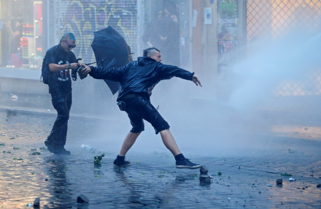 Na placu Pferdemarkt, jednym z centralnych punktów dzielnicy, agresywny tłum obrzuca policjantów kamieniami i butelkami. Funkcjonariusze ostrzeliwani są też metalowymi kulkami wystrzeliwanymi z procy. Policja skierowała do akcji armatki wodne, by rozpędzić liczące kilkaset osób zgromadzenie.