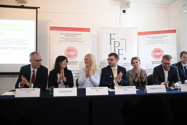 Na zdjęciu (od lewej): Mariusz Korpalski z Forum Prawników Finansowych, Justyna Dziubak, Barbara Husiew ze stowarzyszenia "Stop Bankowemu Bezprawiu", Arkadiusz Szcześniak z SBB, Magdalena Owoc oraz Jacek Czabański i Krzysztof Orski z FPF podczas konferencji prasowej po ogłoszeniu wyroku TSUE dotyczącego sprawy C-260/18 Dziubak, 3 bm. Prawo UE nie stoi na przeszkodzie unieważnieniu umów dotyczących kredytów we frankach szwajcarskich - orzekł Trybunał Sprawiedliwości Unii Europejskiej w Luksemburgu.