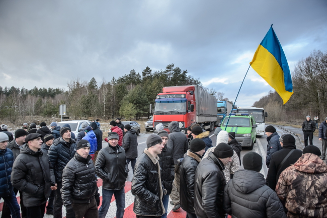 Na zdjęciu: Ukraińscy górnicy z kopalń węgla kamiennego w obwodzie lwowskim blokują międzynarodową trasę ze Lwowa do Warszawy.