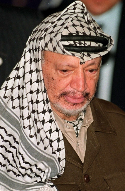 Na zdjęciu: Arafat, który zmarł 11 listopada 2004 roku we francuskim szpitalu wojskowym w Clamart po trwającej miesiąc chorobie. Oficjalnie podawaną przyczyną śmierci był udar, nie przeprowadzono jednak autopsji.