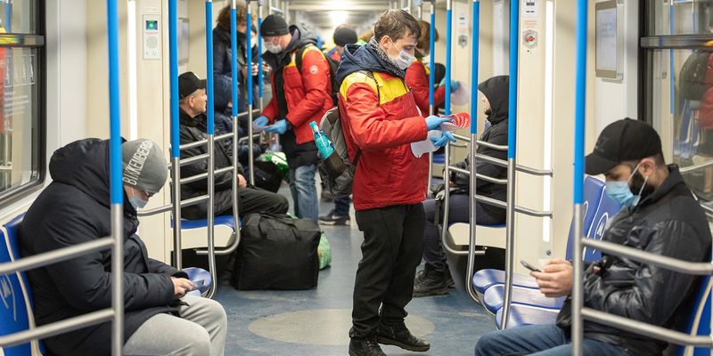 Na zdjęciu: pasażerowie w maseczkach ochronnych w moskiewskim metrze.