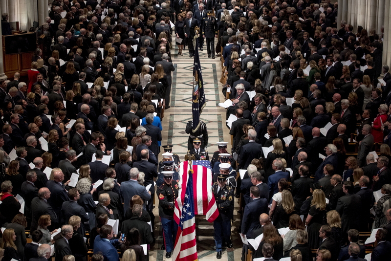 Nabożeństwo żałobne w neogotyckiej świątyni rozpoczęło się od wniesienia przez poczet sztandarowy amerykańskich sił zbrojnych w towarzystwie najbliższej rodziny trumny z ciałem byłego prezydenta.