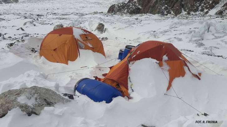 W piątek podczas podchodzenia do obozu pierwszego na 5900 m samoistnie spadający kamień uderzył Rafała Fronię w przedramię, powodując złamanie. Po zejściu do bazy i zaopatrzeniu medycznym, naczelny kronikarz – jak nazwali go koledzy – ma być w sobotę przetransportowany helikopterem do szpitala w Skardu, jeśli pozwoli na to pogoda.