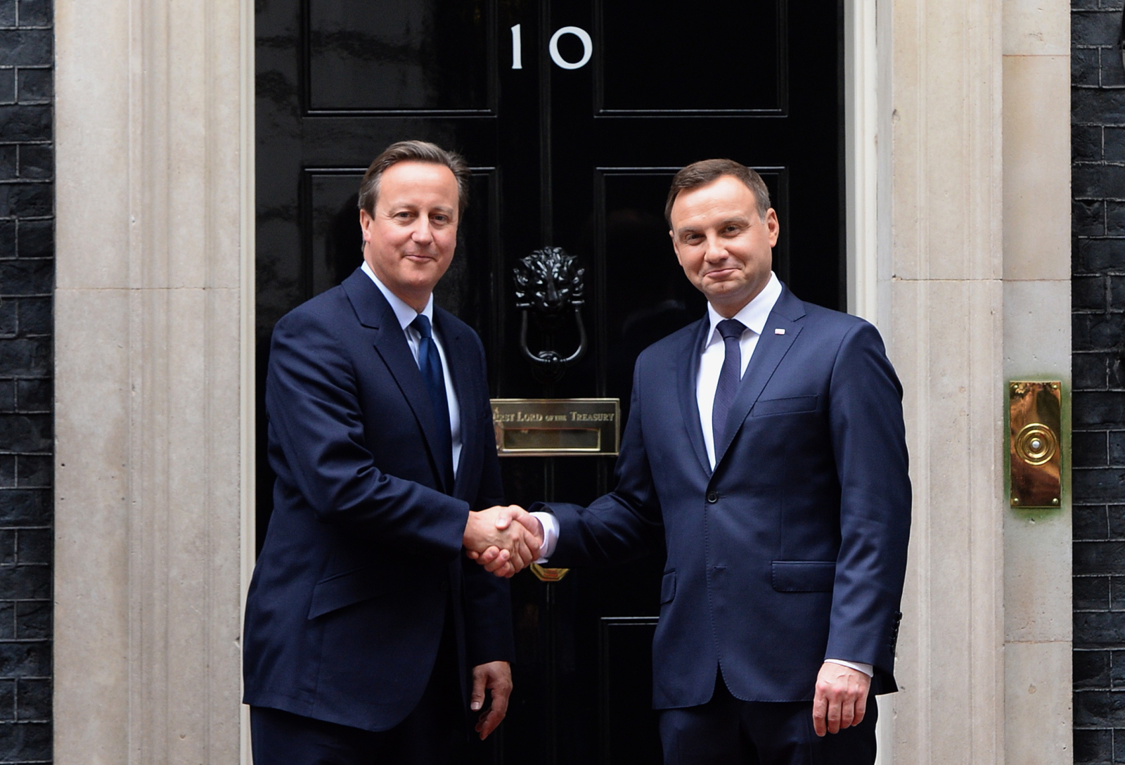 Na zdjęciu: Andrzej Duda i David Cameron podczas powitania, przed spotkaniem w rezydencji premiera w Londynie