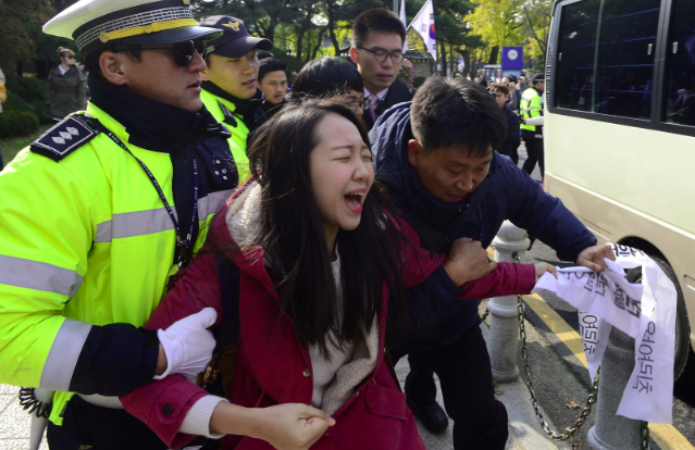 Na zdjęciu: Spotkaniu polityków towarzyszyły protesty. Ich uczestnicy, próbujący wedrzeć się do seulskiego pałacu prezydenckiego, domagali się od Japonii m.in. kolejnych przeprosin.
