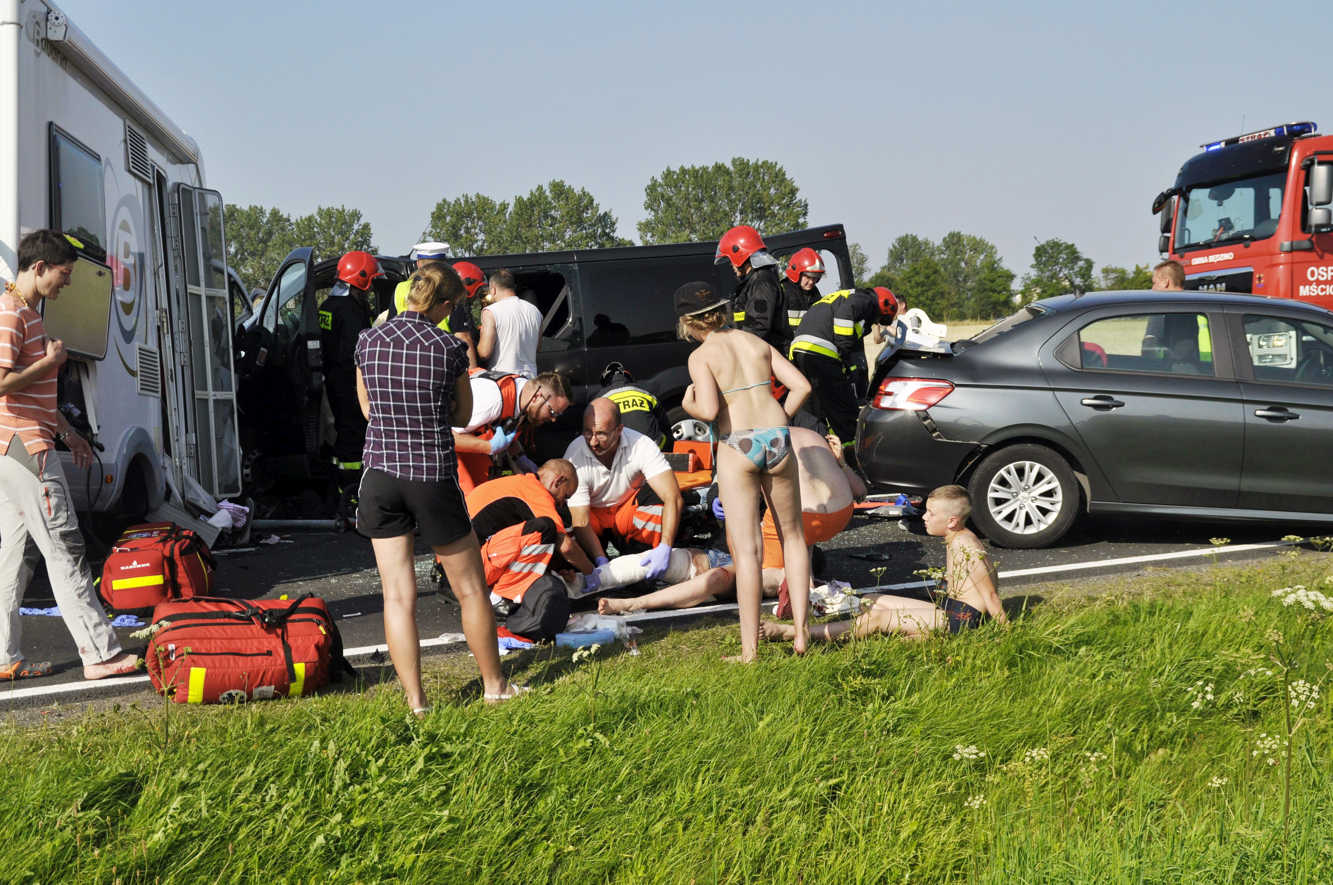 Do zdarzenia doszło w poniedziałkowe (25 lipca) popołudnie. Policja ustaliła, że kierujący kamperem - fiatem ducato na francuskich numerach rejestracyjnych wjechał w stojącego w korku samochodowym peugeota. To auto uderzyło w toyotę. Z kolei kamper zjechał na przeciwny pas ruchu i czołowo zderzył się z prawidłowo jadącym busem.
