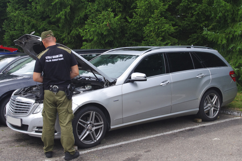 Funkcjonariusz SG przy zatrzymanym samochodzie. Fot. Morski Oddział Straży Granicznej