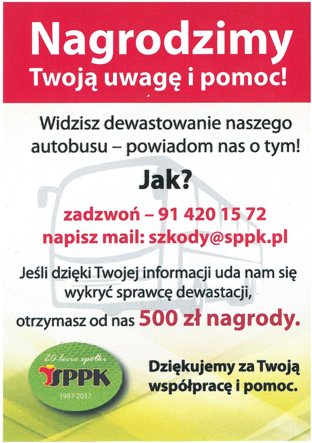 - Akcja „Nagrodzimy Twoją uwagę i pomoc” rozpoczęła się w lipcu tego roku - informuje Grzegorz Ufniarz, kierownik Działu Przewozów SPPK. - Nasze autobusy są monitorowane, ale przeglądanie nagrań zajmuje sporo czasu. Szybka reakcja pasażerów znacznie ułatwia ujęcie wandala i ukaranie go.