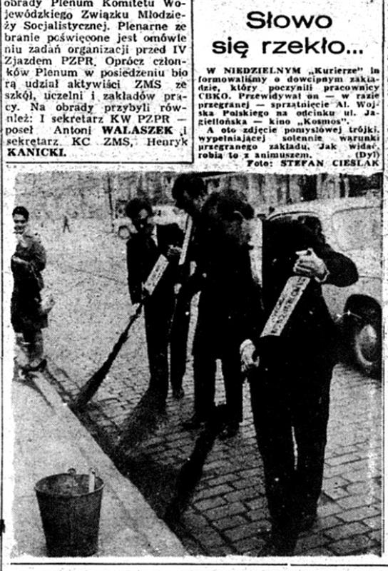 W podpisie do zdjęcia czytamy: W niedzielnym „Kurierze” informowaliśmy o dowcipnym zakładzie, który poczynili pracownicy CBKO. Przewidywał on - w razie przegranej – sprzątnięcie Al. Wojska Polskiego na odcinku ul. Jagiellońska - kino „Kosmos”. A oto zdjęcie pomysłowej trójki, wypełniające solennie warunki przegranego zakładu. Jak widać robią to z animuszem.