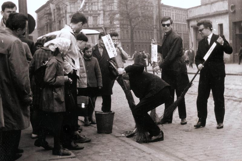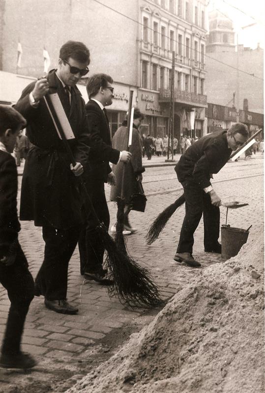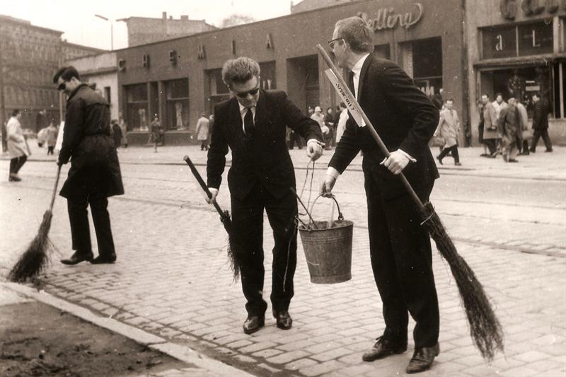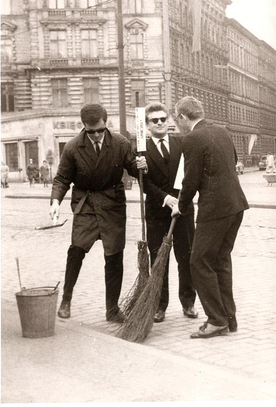 Na zdjęciach widzimy trzech eleganckich młodych mężczyzn. Ich ubranie odpowiada ówczesnym kanonom mody. Są więc płaszcze typu ortalion, ciemne okulary à la Cybulski, ciemne garnitury i wąskie krawaty popularnie zwane „śledziem”. Całość uzupełniają wyjściowe buty tzw. lakierki. Podsumowując, panowie są elegancko ubrani, nawet za elegancko jak na pracę, jaką wykonują. Otóż młodzi mężczyźni zamiatają tak ulicę!