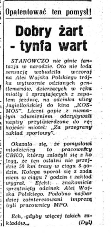 Stanowczo nie ginie fantazja w narodzie. Oto nie lada sensację wzbudziła wczoraj na Alei Wojska Polskiego trójka wytwornie odzianych gentlemanów, dzierżących w ręku miotły i sprzątających z zapałem jezdnię, na odcinku ulicy Jagiellońskiej do kina „Kosmos”. Liczni gapie z niemałym zdumieniem odczytywali napisy przytwierdzone do rękojeści mioteł: „Za przegrany zakład sportowy”.