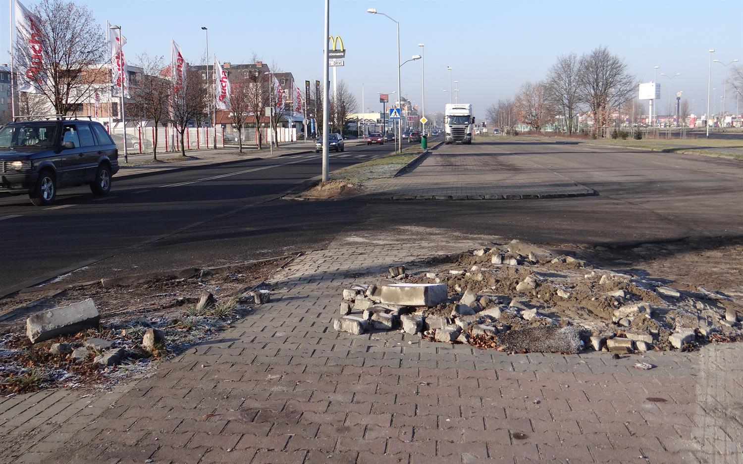 Na zdjęciu: Przez ciężarówki zdemolowane zostały już niemal wszystkie wjazdy i wyjazdy parkingowe.