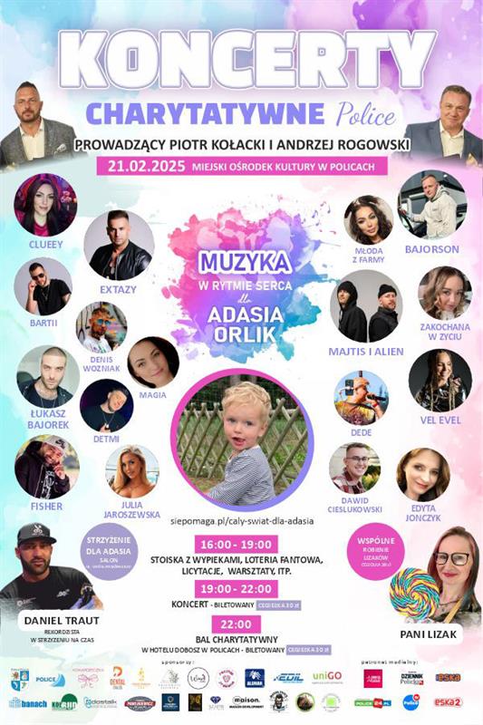 – Spotykamy się 21 lutego o godz. 16 w Miejskim Ośrodku Kultury przy ul. Siedleckiej w Policach – zaprasza Piotr Kołacki, jeden z organizatorów i prowadzących wydarzenie. – Pierwszą część uświetnią nasi lokalni wykonawcy. Będą licytacje, stoiska z pysznościami i inne, będzie loteria. A o godz. 19 rozpocznie się fantastyczny koncert z „Kokardeczką” – będzie wielu fajnych wykonawców i już wiemy, że dużo osób z Polski się wybiera. A po koncercie będzie bankiet w Hotelu Dobosz. Oczywiście gramy dla Adasia Orlika, który potrzebuje 14 milionów. Przybywajcie, pomagamy, wszyscy razem. Wstęp na tę część od godz. 16 do 19 jest bezpłatny. Na koncert o godz. 19 trzeba kupić bilet-cegiełkę za 30 złotych, a na przyjęcie w Hotelu Dobosz, o godz. 22, również obowiązuje cegiełka za 30 złotych.