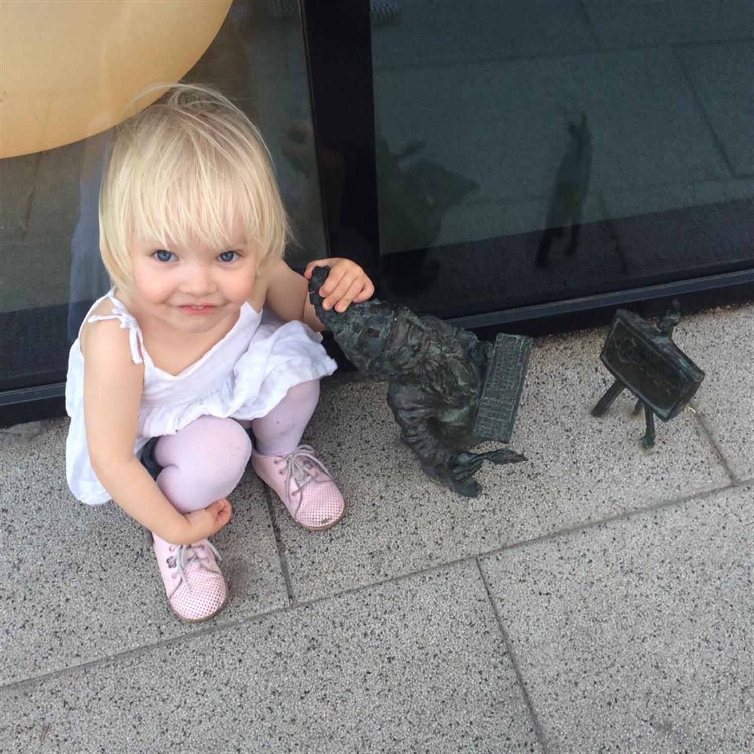 - Dziewczynka ma blond włosy do ramion, ubrana jest w niebieskie długie spodnie i białą bluzkę z obrazkiem oraz szarą bluzę.