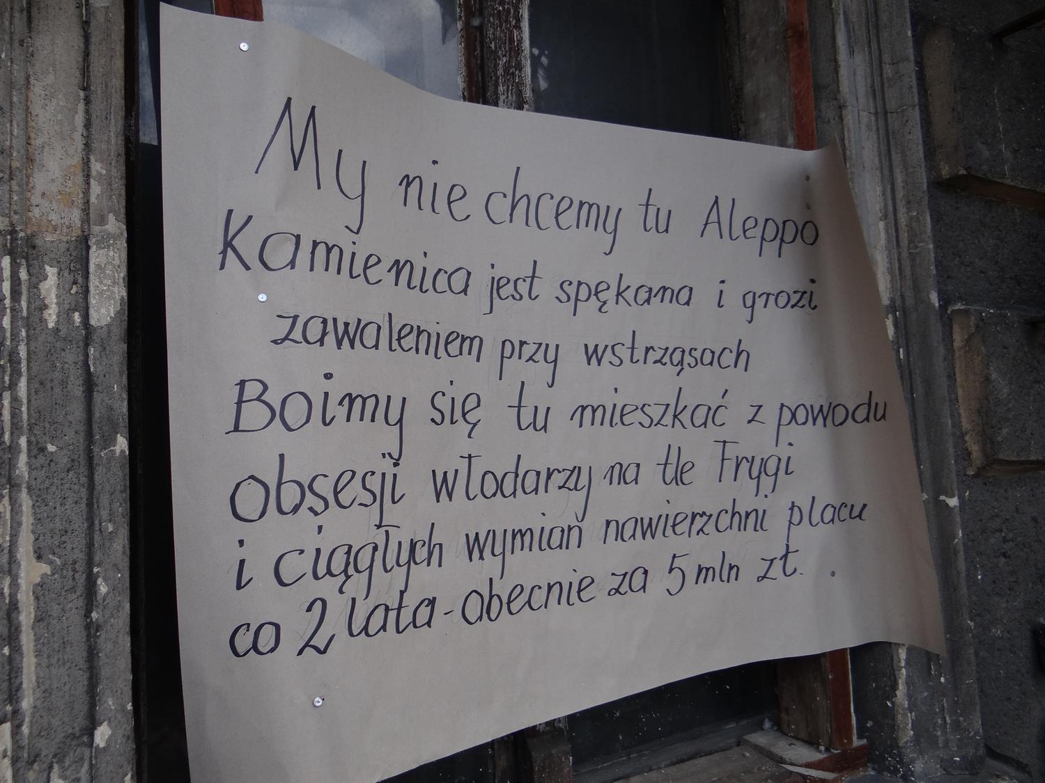 Wobec zagrożenia, jakie - zdaniem naszej rozmówczyni - stwarzają prowadzone tam nie po raz pierwszy przy użyciu ciężkich maszyn roboty drogowe wśród ścisłej, w większości zaniedbanej, nieremontowanej i zdekapitalizowanej przedwojennej zabudowie, pani Janina w geście protestu jako jedna z lokatorek kamienic wywiesiła transparent następującej treści: " My nie chcemy tu Aleppo. kamienica jest spękana i grozi zawaleniem przy wstrząsach. Boimy się tu mieszkać z powodu obsesji włodarzy na tle Frygi i ciągłych wymian nawierzchni placu co 2 lata - obecnie za 5 mln zł".
