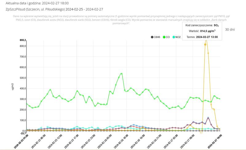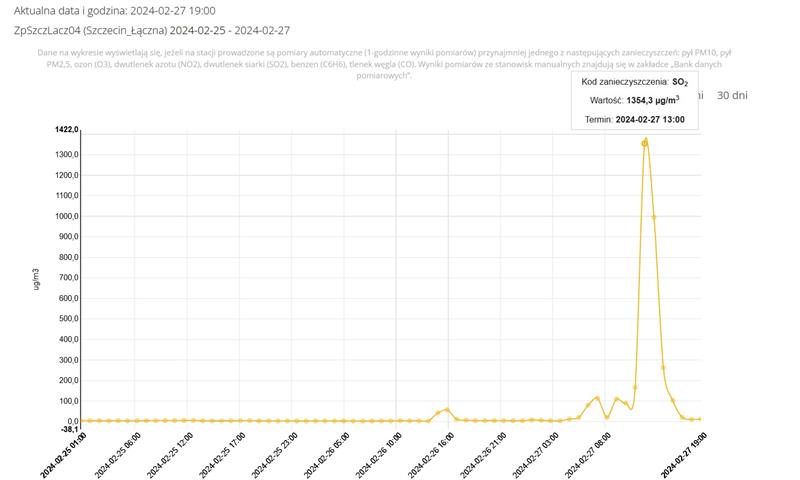 - W dniu 27.02.2024 roku od godzin porannych zaczęły rosnąć stężenia dwutlenku siarki SO2 w powietrzu na obszarze miasta Szczecin, notowane na stacjach pomiarów automatycznych przy ul. Łącznej i ul. Piłsudskiego - podaje komunikat opracowany przez Regionalny Wydział Monitoringu Środowiska w Szczecinie Departament Monitoringu Środowiska Głównego Inspektoratu Ochrony Środowiska. - O godzinie 13.00 stężenia dwutlenku siarki osiągnęły wartość 1354,3 μg/m3 na stacji przy ul. Łącznej oraz wartość 814,5 μg/m3 na stacji przy ul. Piłsudskiego. Mając na uwadze obserwowane wysokości stężeń tego zanieczyszczenia, istnieje wysokie ryzyko przekroczenia poziomu alarmowego dla dwutlenku siarki SO2 na obszarze miasta Szczecin.