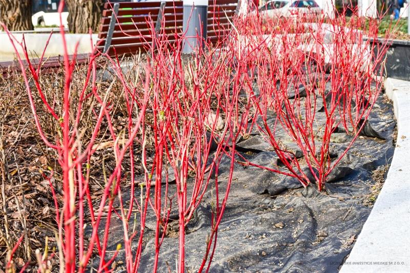 Na tym nie koniec nowych nasadzeń w tym rejonie. O czym świadczą wciąż niezagospodarowane zieleńce oraz nieobsadzone donice, szczególnie w bliskości nowej fontanny – tzw. długiego ramienia ściany wody.