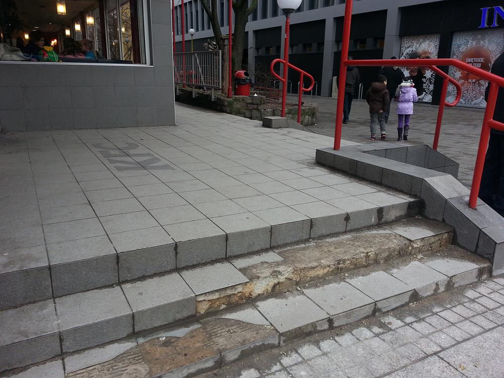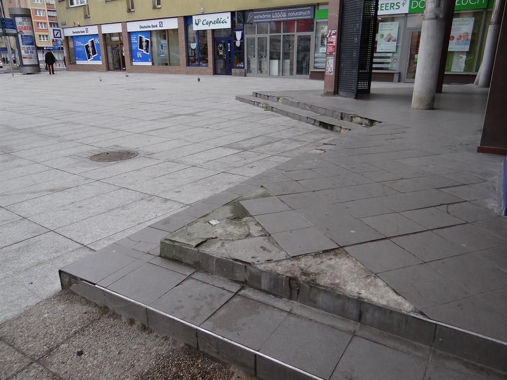 Schodki w narożnym wejściu do fast foodu ,które przycięto, bo właściciel lokalu zaanektował sobie pod nie niegdyś kawałek miejskiego gruntu w pasie drogowym, z wyszczerbionynymi stopniami i odpadającymi kaflami.