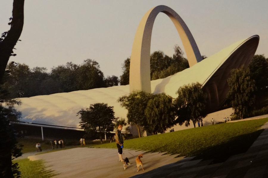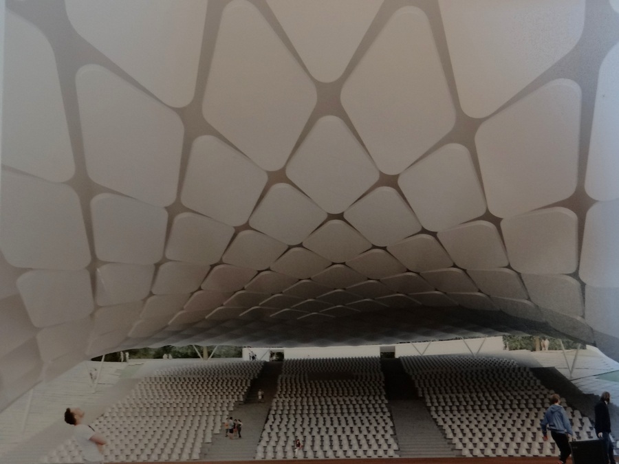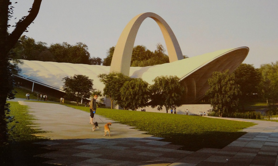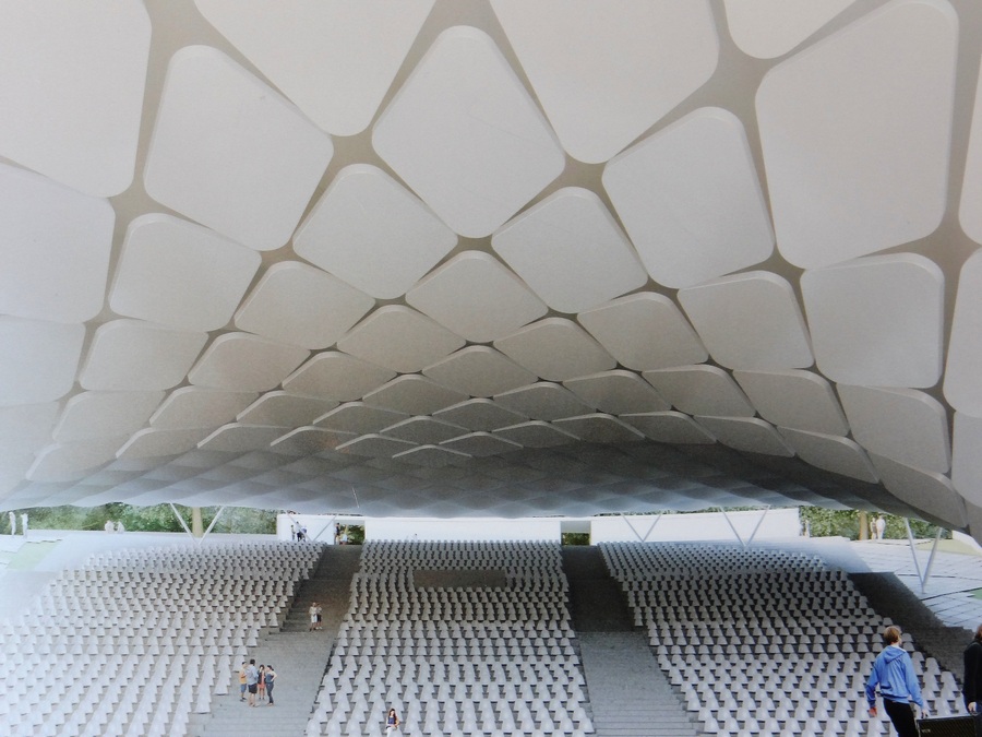 Spośród 16 prac do drugiego jego etapu sąd konkursów, któremu przewodniczył Kazimierz Łatak z Krakowa, zakwalifikował 5 prac. Zwycięska koncepcja Brytyjczyków zakłada budowę zadaszenia w kształcie przypominającym wygiętą parabolę az do poziomu najwyższego tarasu, a z lotu ptaka wijącego się do pobliskiej Rusałki węża. Przy zachowaniu jego dotychczasowego charakterystycznego elementu, czyli łuku. Ma być białą rzezbą na tle zieleni.
