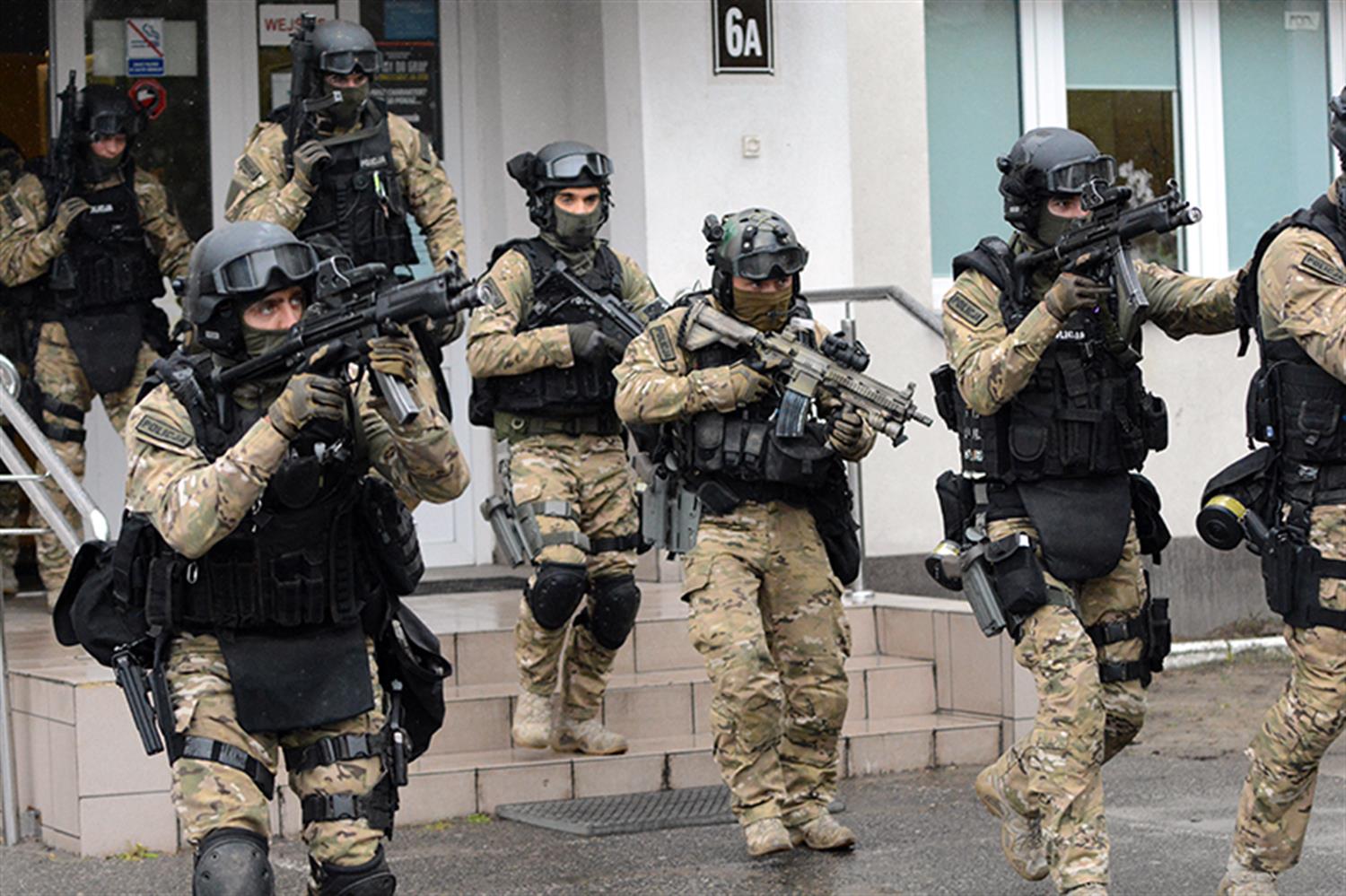 Na zdj.: Uzbrojony w nóż i maczetę napastnik wdarł się do Zespołu Szkół im. I. Łukasiewicza w Policach. Antyterroryści obezwładnili sprawcę i uwolnili zakładników.