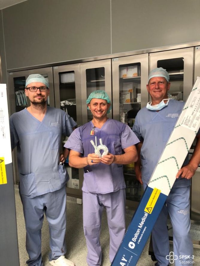 – Dotychczas nie dysponowaliśmy odpowiednią protezą z trzema wewnętrznymi rękawkami, prowadzącymi krew do naczyń głowy i kończyn górnych – tłumaczy dr hab. Arkadiusz Kazimierczak z „aortic team”, który wraz z dr. Pawłem Rynio z Kliniki Chirurgii Naczyniowej, Ogólnej i Angiologii SPSK-2 z sukcesem zoperował 70-letniego pacjenta. Tętniak u mężczyzny został wykryty przypadkowo – nie dawał żadnych objawów, a jego pęknięcie mogło zakończyć się dla niego śmiercią.