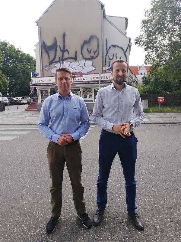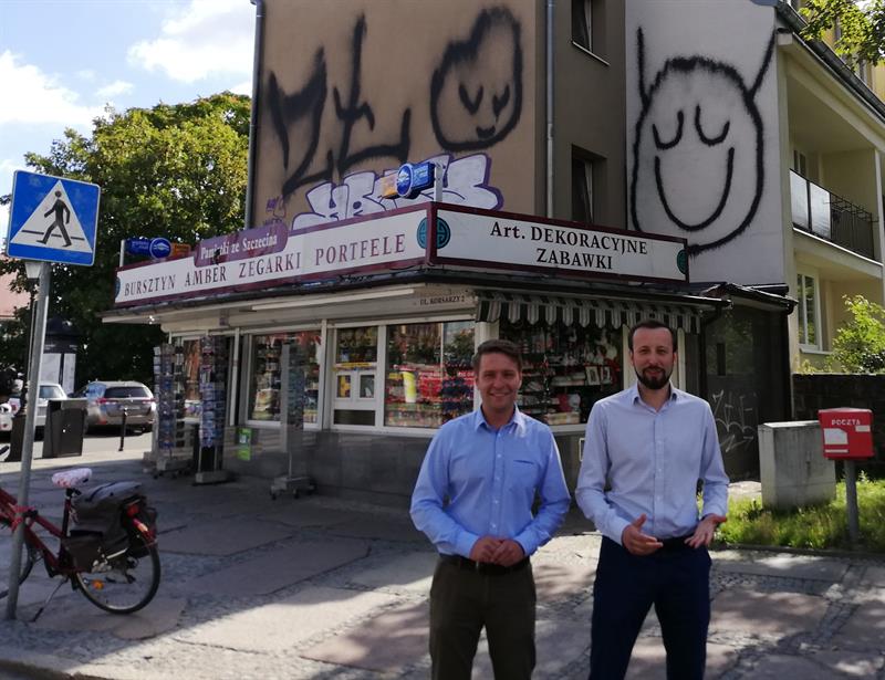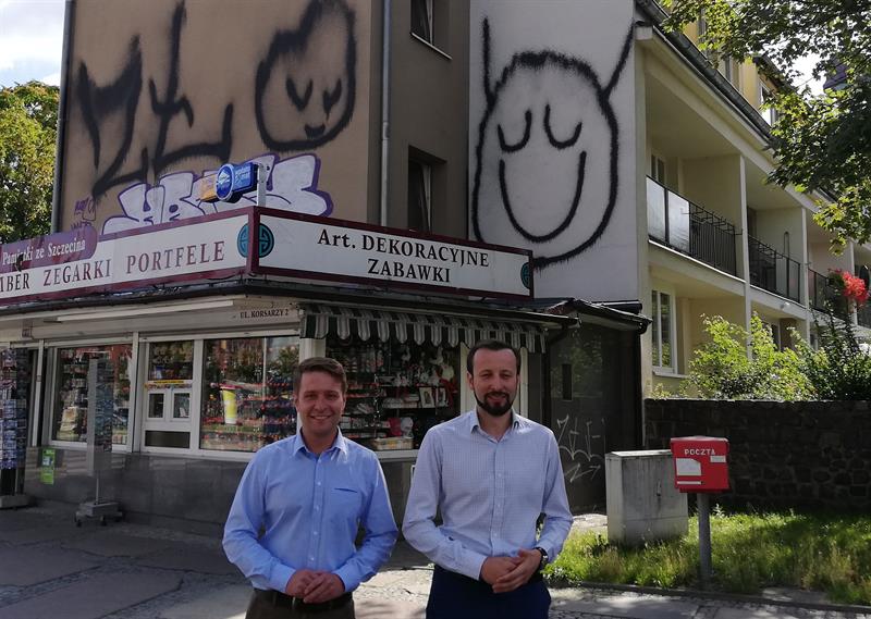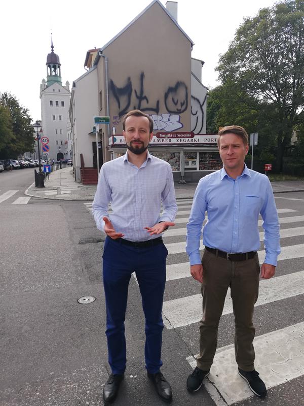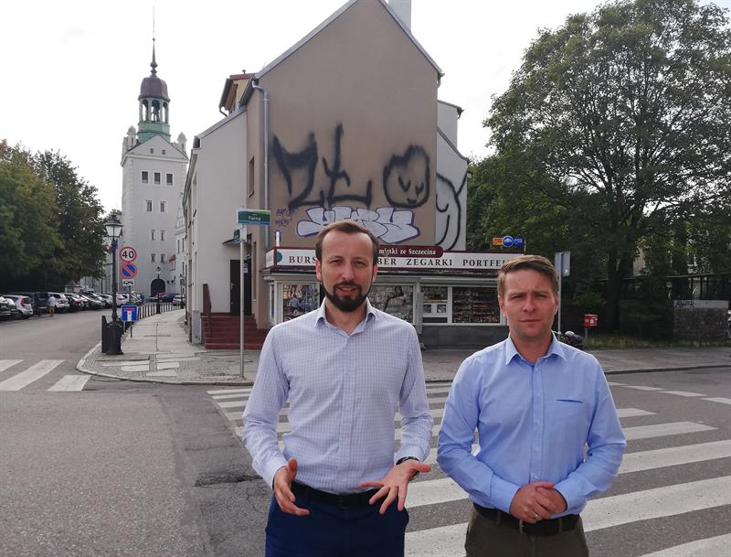 Na zdjęciu: Przemysław Słowik i Andrzej Radziwinowicz ze Szczecińskiej Inicjatywy Miejskiej na tle jednego z najbardziej bezmyślnych aktów wandalizmu, otagowanego jako ZŁO. Czyli u zbiegu ul. Farnej i Korsarzy: w sąsiedztwie Zamku Książąt Pomorskich, a z widokiem na Komendę Wojewódzką Policji w Szczecinie.