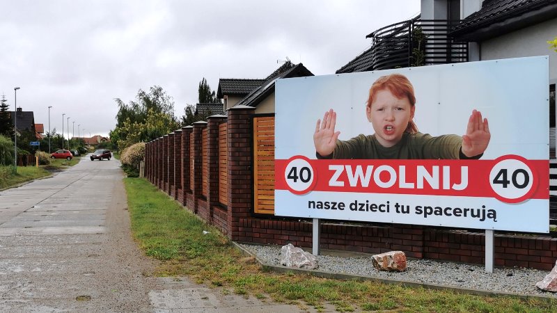 Sebastian Aleksiuk - właściciel posesji przy ulicy Zeusa w Mierzynie - mając na względzie bezpieczeństwo pieszych, wykorzystał powierzchnię reklamową, aby zaapelować do kierowców. Baner ma im przypominać, że w miejscu tym obowiązuje ograniczenie prędkości do 40 km/h. Niestety nie jest ono przestrzegane. Problem potęguje fakt braku chodnika.