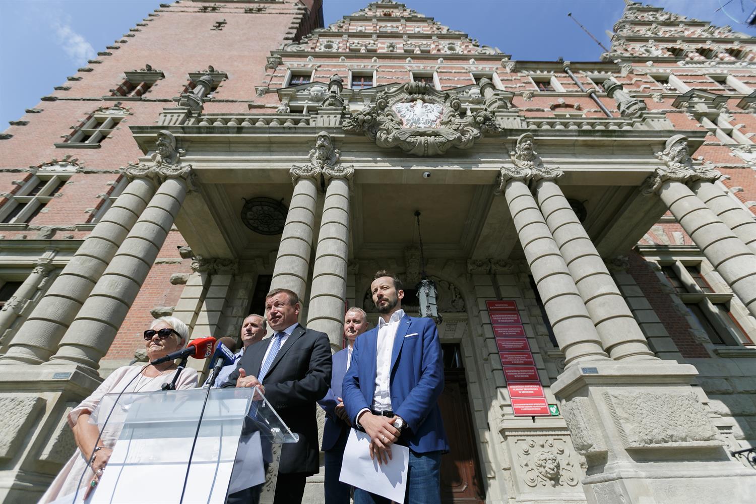 Na zdjęciu: (Od lewej) Magdalena Kochan, Jarosław Rzepa i Przemysław Słowik zorganizowali konferencję przed siedzibą wojewody.