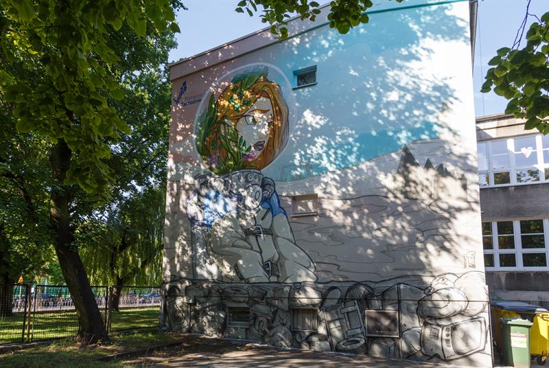 „Wizja przyszłości - mural wywołujący proekologiczne refleksje" - tak o swym najnowszym dziele mówi artysta Maciej Kreda. O ekomuralu, jaki od kilku dni zdobi jedną ze ścian Szkoły Podstawowej nr 54 przy ul. Rayskiego.