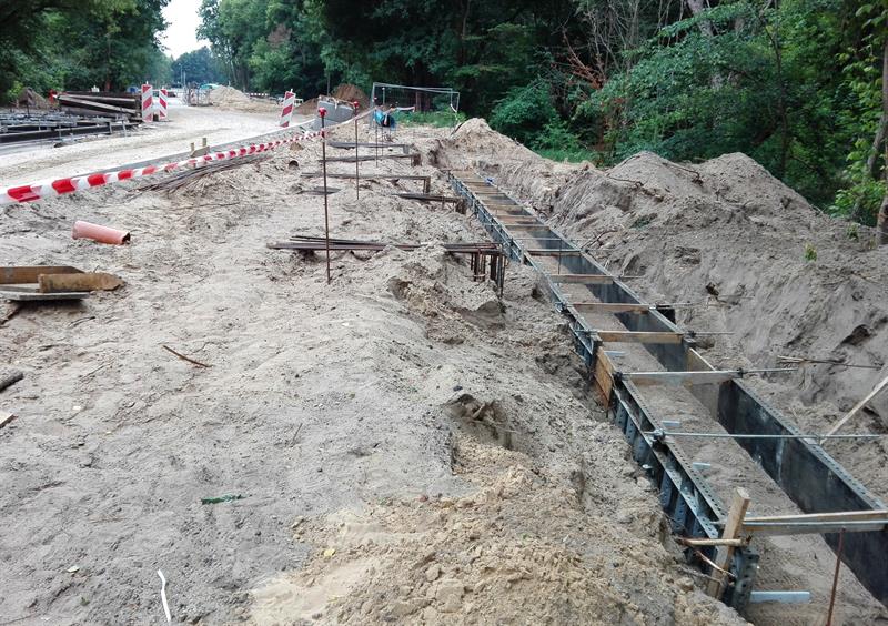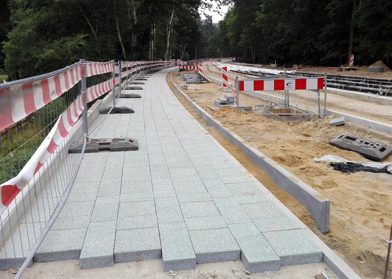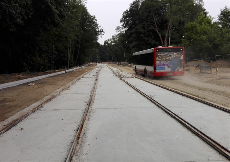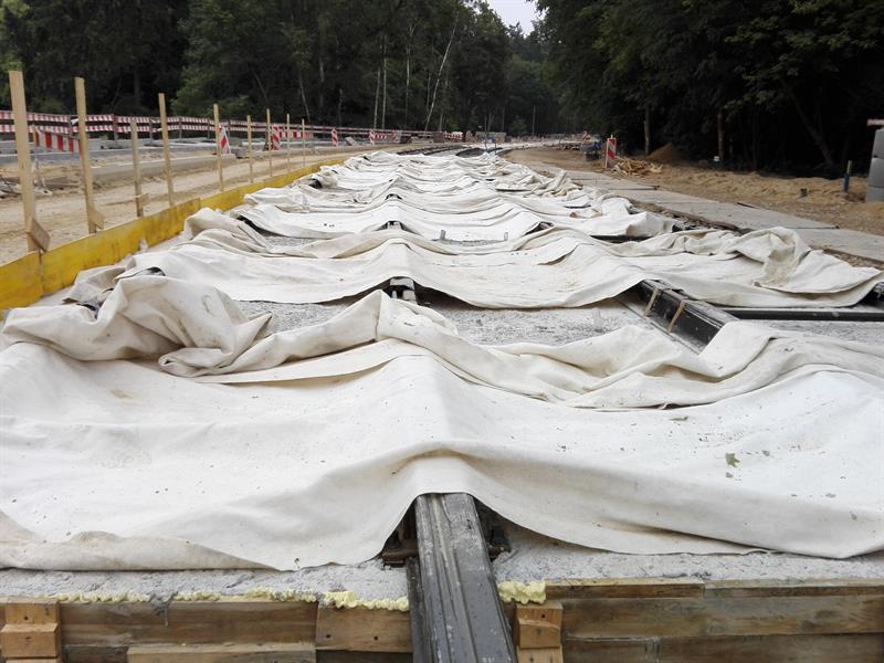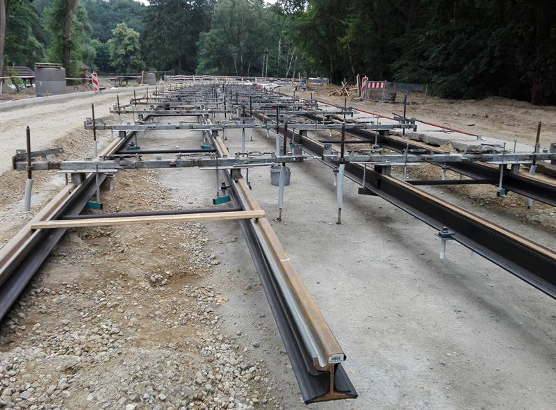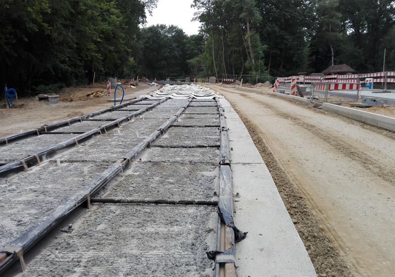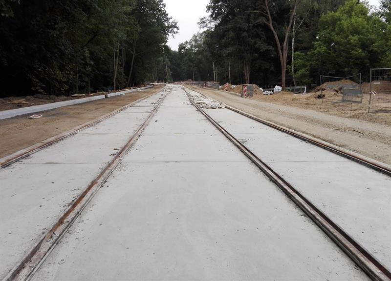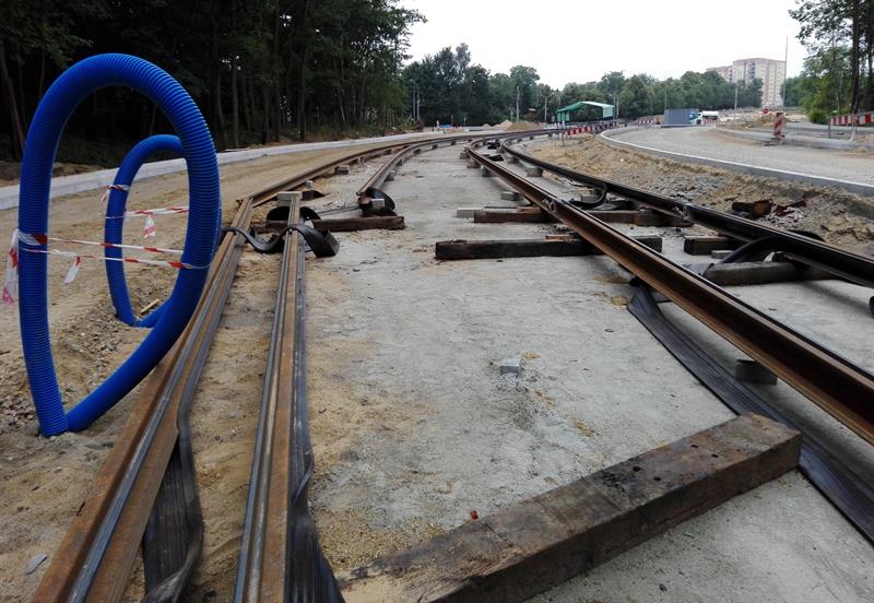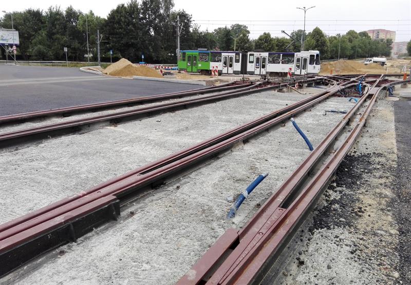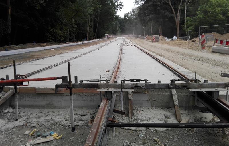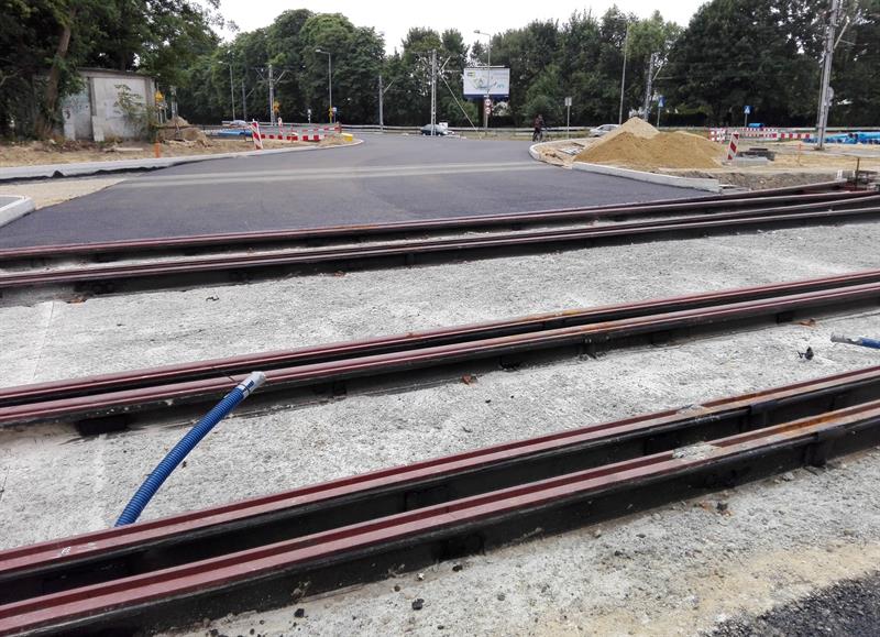 Kolejne z szyn, zwiezionych na plac budowy, są spawane, skręcane, regulowane i przygotowywane wraz z warstwą wyciszającej i tłumiącej drgania otuliną do takiej samej operacji ostatecznego mocowania w betonowym podłożu. Po osadzeniu w warstwie betonowej pierwszych odcinków zmontowanych torów nowej trasy tramwajów rozpoczęło się teraz ich zalewanie kolejną warstwą betonowego podłoża. Przy montażu torowiska uwijają się pracownicy spółki Stan Led ze Stargardu, jednej z firm podwykonawczych zatrudnionych przez Eurovię Polska SA do realizacji tej części całej drogowo-komunikacyjnej inwestycji.