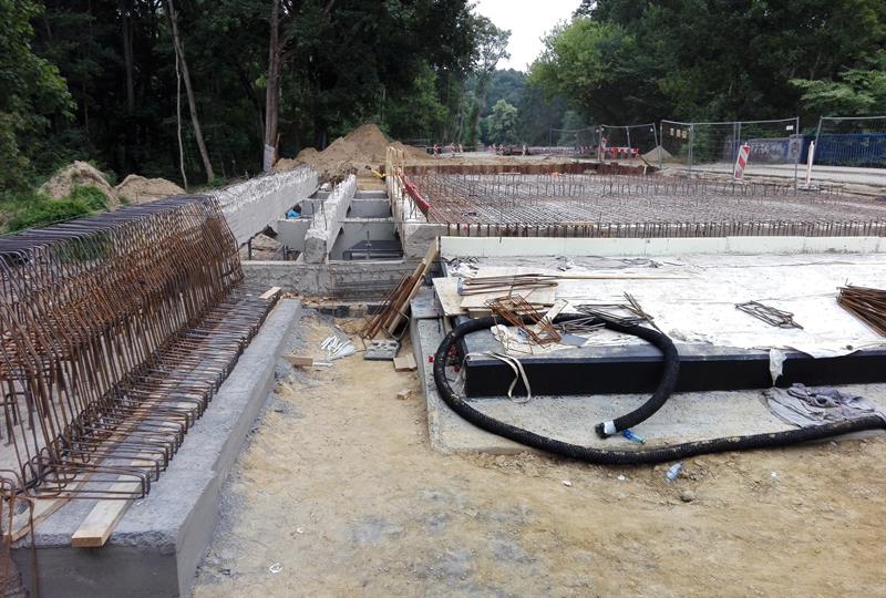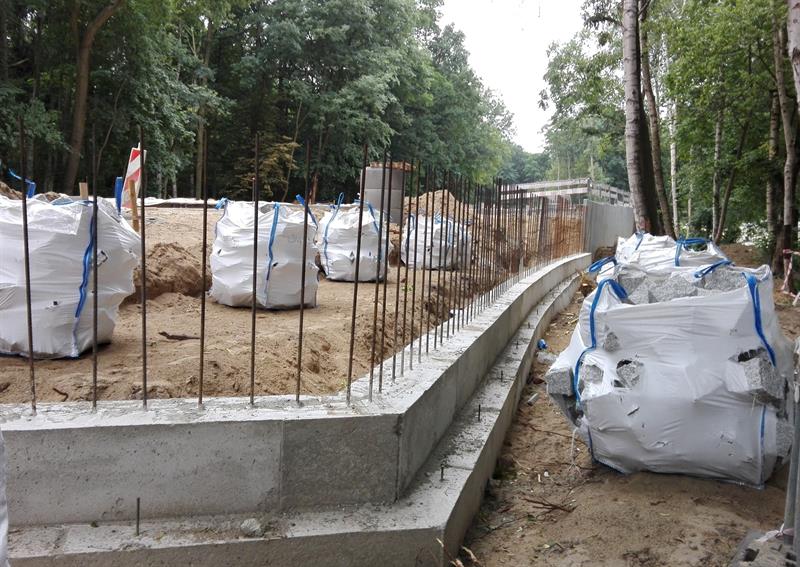 Dalej dobudowywane są ze ścian oporowych kolejne fragmenty nasypu od strony polany Czerwonej przy Arkonce. Wylano już z betonu dolną płytę mocującą do podłoża tory od strony montowanego rozjazdu u zbiegu ul. Arkońskiej z al. Wojska Polskiego i ul. Władysława Szafera. W identyczny sposób osadzony też został na 30-centymetrowej warstwie betonu fragment gotowych torów bliżej ostrego zakrętu na wysokości ul. Międzyparkowej i starego przystanku autobusów linii 80 „Stadion Arkonia nż” do okolic wjazdu na parking polany Czerwonej.