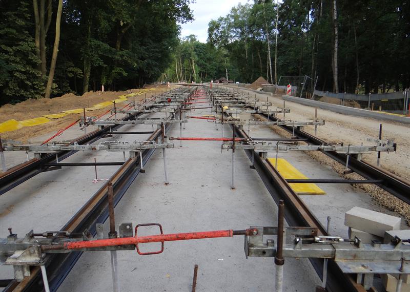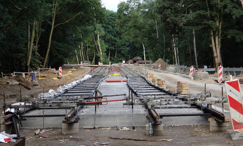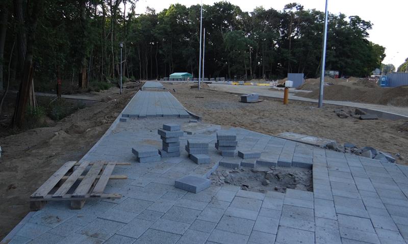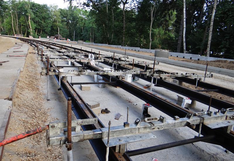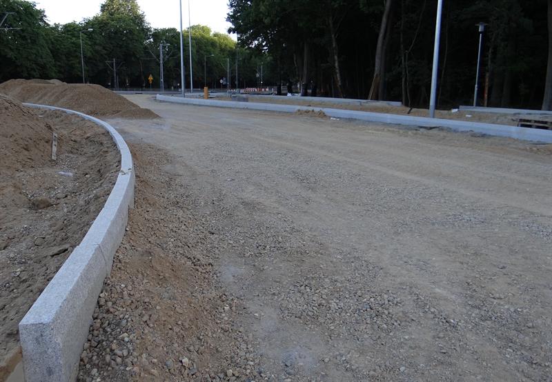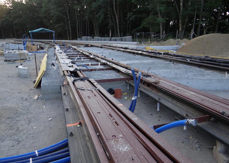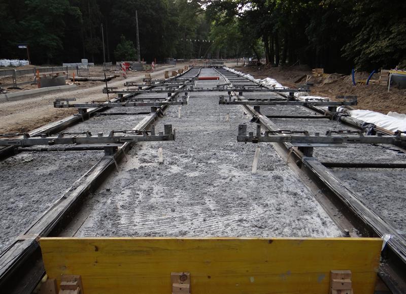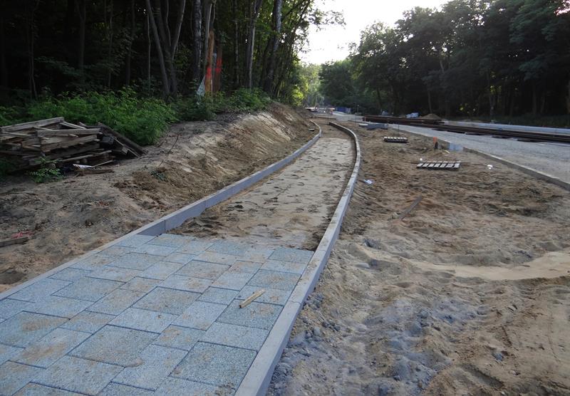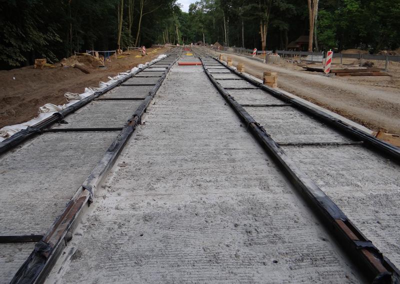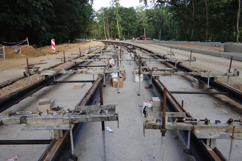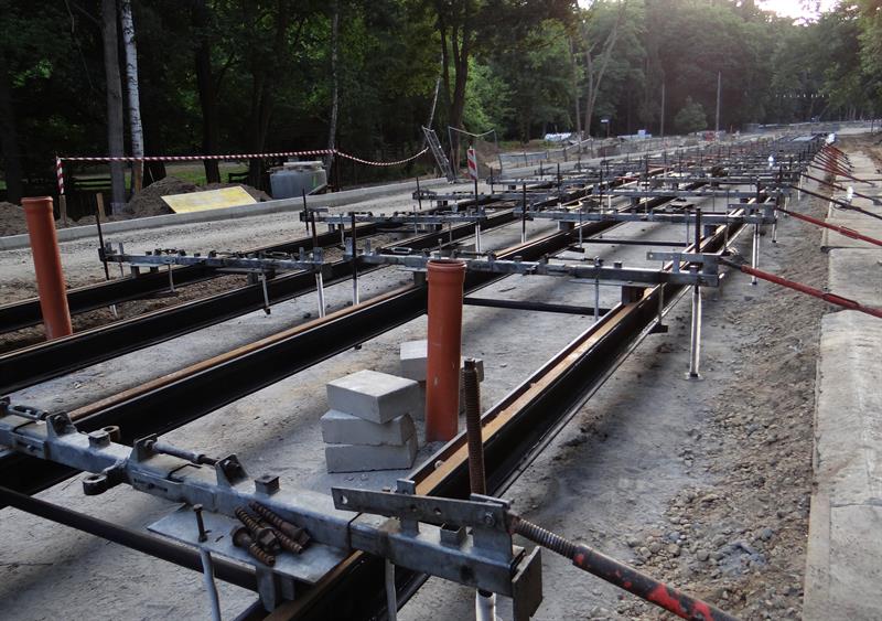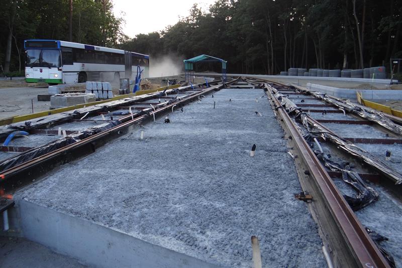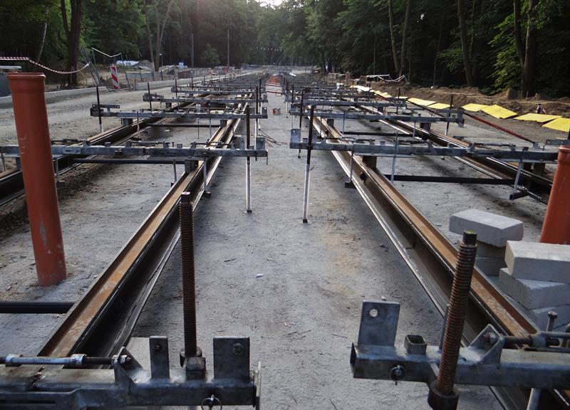 Dobudowywane są ze ścian oporowych kolejne fragmenty nasypu od strony polany Czerwonej przy Arkonce. Wylano z betonu dolną płytę mocującą do podłoża tory od strony montowanego rozjazdu przy skrzyżowaniu ul. Arkońskiej z al. Wojska Polskiego i ul. Władysława Szafera. W identyczny sposób osadzony też został na 30-centymetrowej warstwie betonu fragment gotowych torów bliżej ostrego zakrętu na wysokości ul. Międzyparkowej i starego przystanku autobusów linii 80 "Stadion Arkonia nż". Kolejne z szyn, zwiezionych na plac budowy, są spawane, skręcane, regulowane i przygotowywane wraz z warstwą wyciszającej i tłumiącej drgania otuliną do takiej samej operacji ostatecznego mocowania w betonowym podłożu.