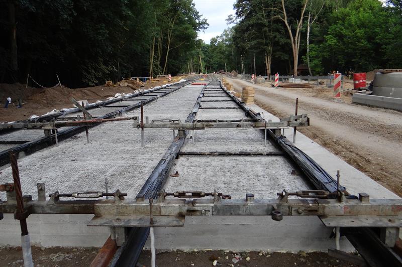 Pierwsze odcinki szyn obu torów nowej trasy tramwajów budowanej wzdłuż ul. Arkońskiej w Szczecinie już na swoim miejscu. Osadzone zostały na 30-centymetrowej warstwie betonowej wylewki. W rejonie powstającego ronda u zbiegu z al. Wojska Polskiego, po wyznaczeniu i wykonaniu podbudowy nowej jezdni trwają teraz prace przy układaniu chodnika od strony lasu. A to ledwie część robót.