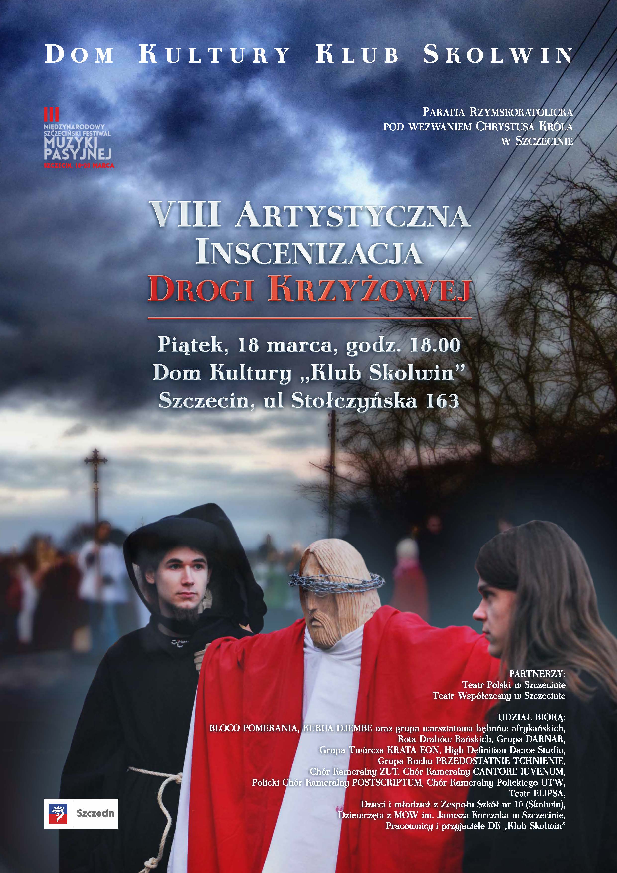 Ósma już Artystyczna Inscenizacja Drogi Krzyżowej rozpocznie się w piątek 18 marca o godzinie 18.00 . Tradycyjnie pierwsze stacje odbędą się na terenie DK „Klub Skolwin”, następnie orszak składający się z artystów i zgromadzonych widzów przebędzie drogę na teren przykościelny Parafii pod wezwaniem Chrystusa Króla na ul. Inwalidzkiej.