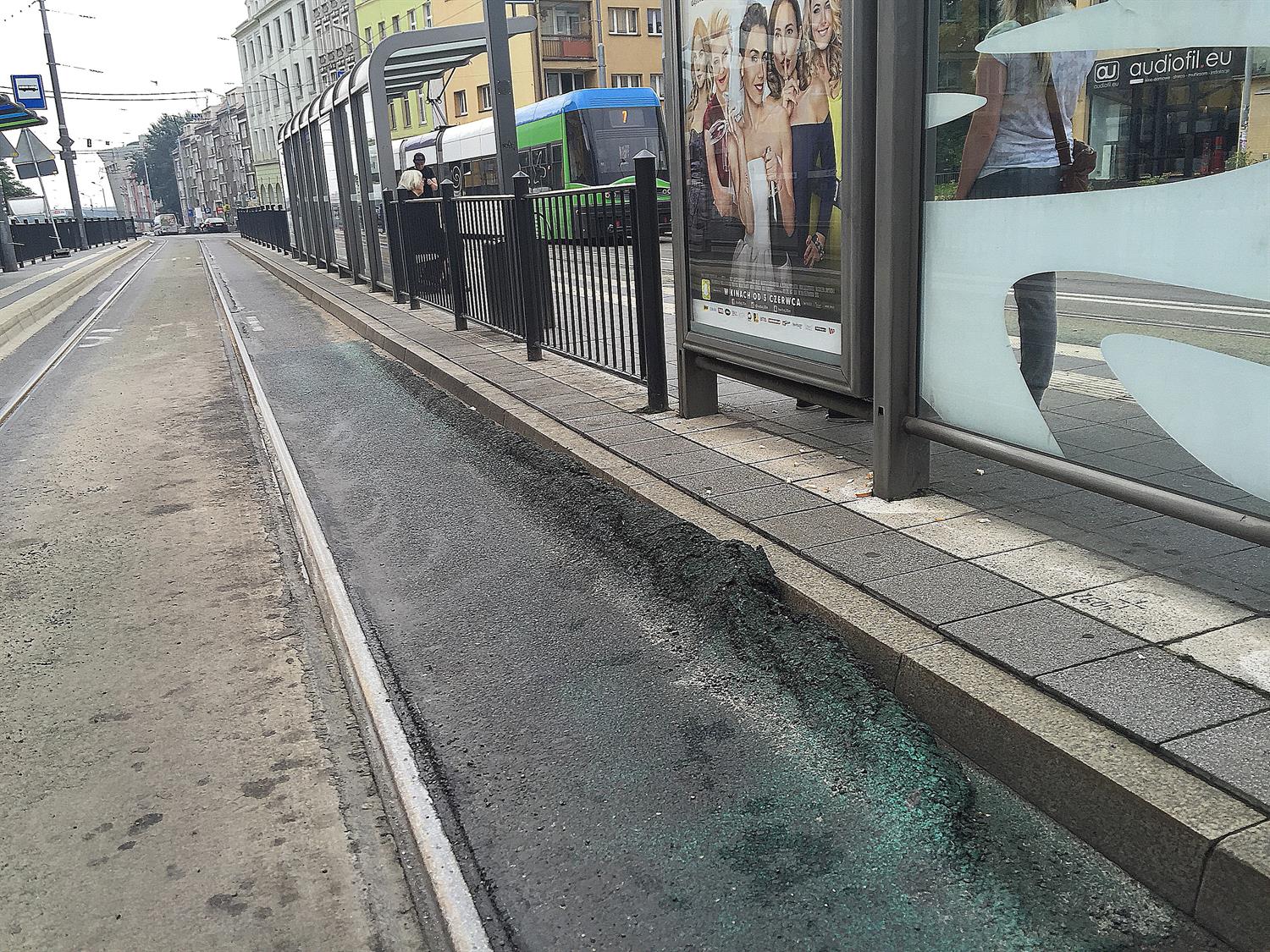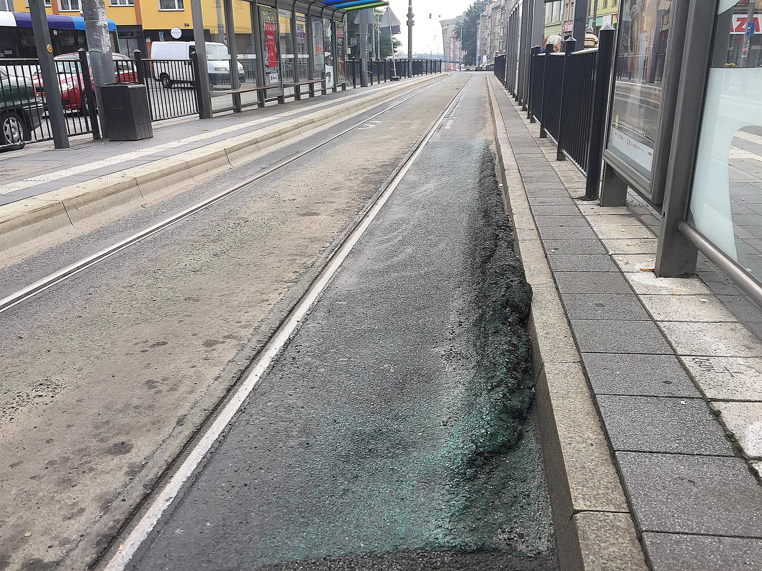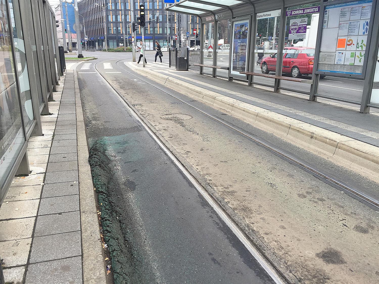 Dopiero co Zarząd Dróg i Transportu Miejskiego obwieścił operację wymiany krzyżownic w torach tramwajowych na użytkowanym od ledwie czterech lat węźle komunikacyjnym Brama Portowa. Nocna akcja przy infrastrukturze to jedno. Może by tak przy tej okazji i zainteresować się tym, co dzieje się na pasach autobusowo-tramwajowych przy przystankach. Tak jak na załączonych zdjęciach prezentuje się na przykład od dobrych kilku miesięcy nawierzchnia przystanku, gdzie zatrzymują się m. in. tramwaje linii 2 i autobusy linii pospiesznych, które nadjeżdżają ul. Wyszyńskiego z prawobrzeża. Warstwa asfaltu niczym zmrożona fala w locie. ©℗