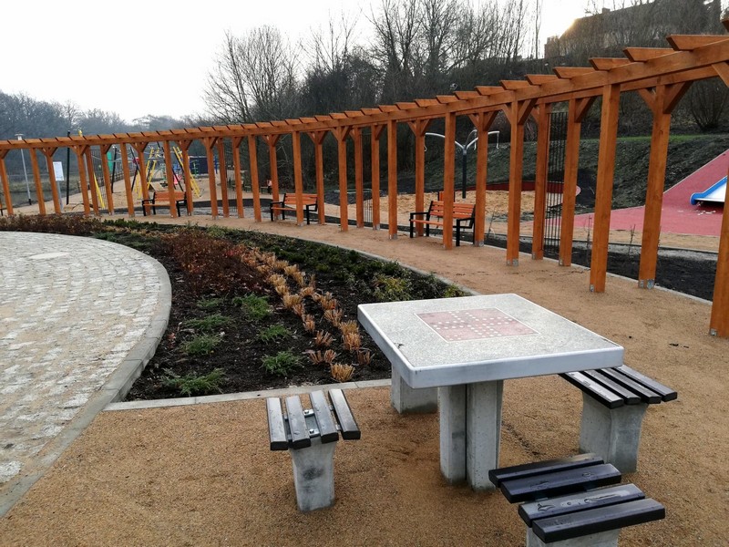 Nie brakuje też miejsca do odpoczynku: ławek i wiat piknikowych. Elementami ozdobnymi są zegar słoneczny i pergole. W ramach realizacji projektu przewidziano również wzbogacenie zieleni parkowej o nowe nasadzenia krzewów, pnączy oraz bylin i traw ozdobnych.
