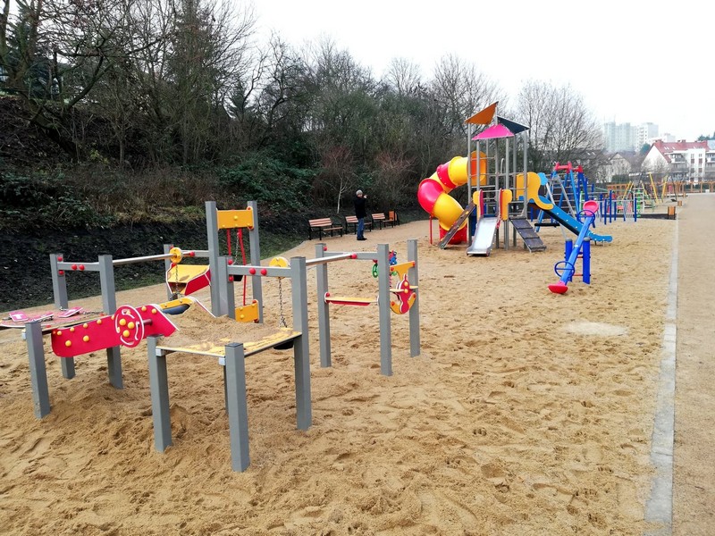 Wśród parkowej zieleni pojawiły się place zabaw dla dzieci młodszych i starszych, na których oprócz tradycyjnych urządzeń do zabawy znalazły się m.in. "tyrolka" czy zjeżdżalnie ułożone na skarpie. Strefa sportu to przede wszystkim wielofunkcyjne miniboisko oraz przyrządy do street workoutu. Jest tam także ścieżka sensoryczna, czyli o zróżnicowanej nawierzchni, stymulująca rozwój młodszych dzieci. Jej uzupełnieniem jest kompozycja rozmaitych roślin. Dla miłośników aktywnego wypoczynku, oprócz typowych urządzeń do ćwiczeń, ustawiono stoły do gry w szachy i chińczyka, piłkarzyki oraz tenisa stołowego.