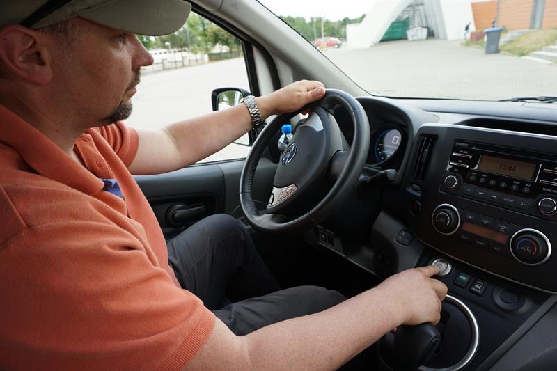 Kierując na placu mikrobusem nissan e-NV 200, tłumaczy, jak układ napędowy odzyskuje część energii elektrycznej. Auto porusza się niemal bezszelestnie. Służy do przewozu pracowników, narzędzi w dziale utrzymania czystości i porządku ZDiTM.