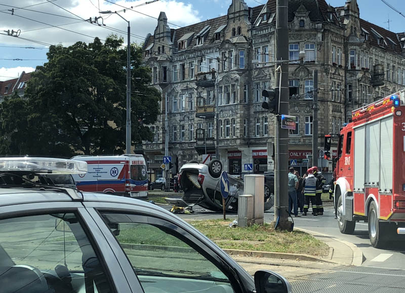 Jak informuje policja, auto, które dachowało, upadło na tory, w związku z czym wstrzymane zostało kursowanie tramwajów, oprócz jadących z Pomorzan przez pl. Kościuszki. Ruch będzie przywrócony, gdy pracę zakończą służby – policjanci i strażacy.