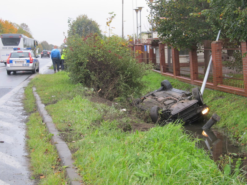Jadący samochodem osobowym mężczyzna, prawdopodobnie nie dostosował prędkości auta do warunków atmosferycznych, na łuku drogi uderzył w latarnię i zjechał do rowu, gdzie dachował.
