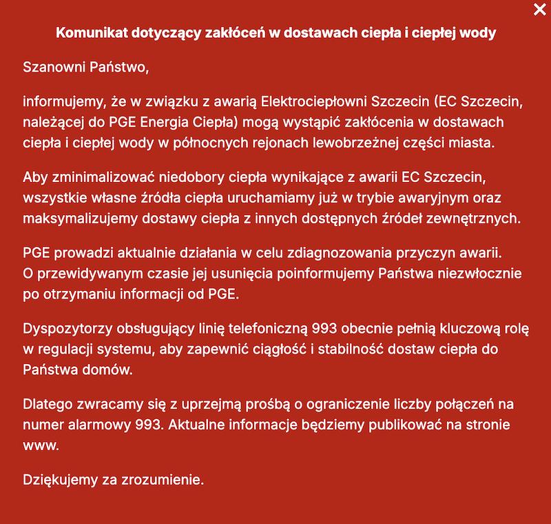 "O przewidywanym czasie jej usunięcia poinformujemy Państwa niezwłocznie po otrzymaniu informacji od PGE. Dyspozytorzy obsługujący linię telefoniczną 993 obecnie pełnią kluczową rolę w regulacji systemu, aby zapewnić ciągłość i stabilność dostaw ciepła do Państwa domów" - brzmi dalsza część komunikatu.