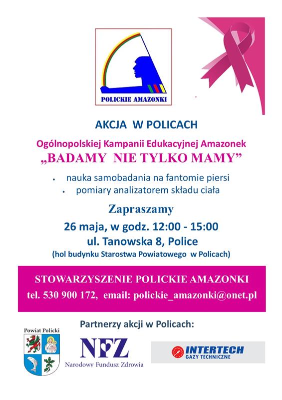 Do udziału w akcji "Badamy nie tylko Mamy" zapraszają Powiat Policki i Stowarzyszenie „Polickie Amazonki”. Odbędzie się w piątek 26 maja w holu Starostwa Powiatowego w Policach przy ul. Tanowskiej 8 w godzinach 12-15. Z okazji Dnia Matki w 85 polskich miastach, członkinie klubów Amazonek będą edukować nt. profilaktyki raka piersi.