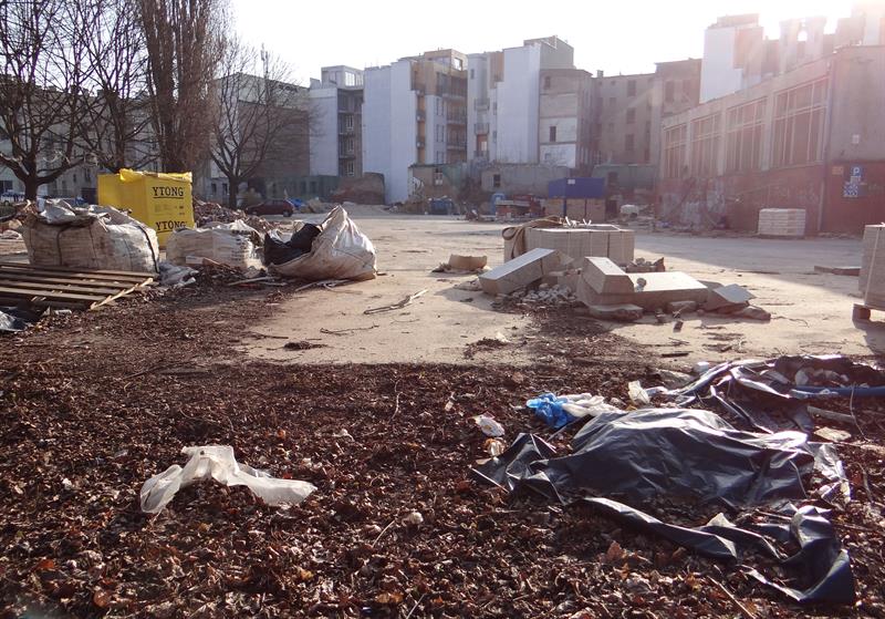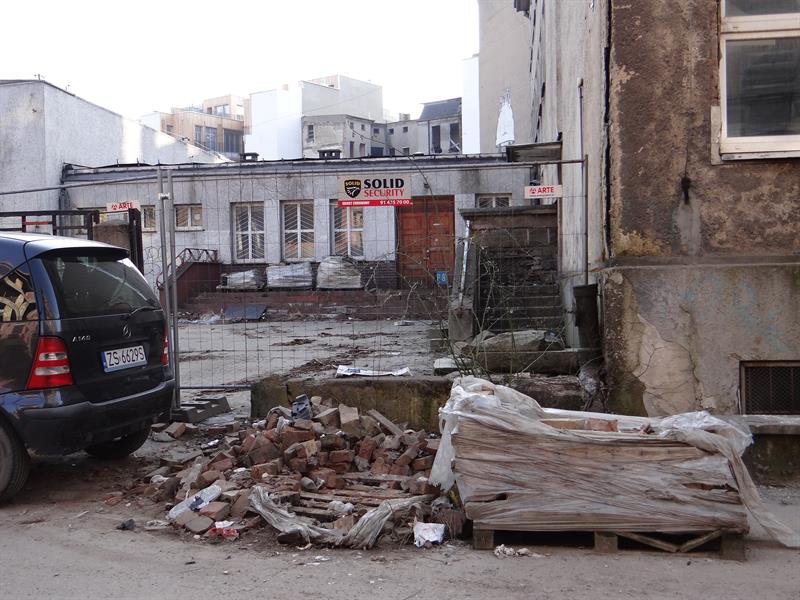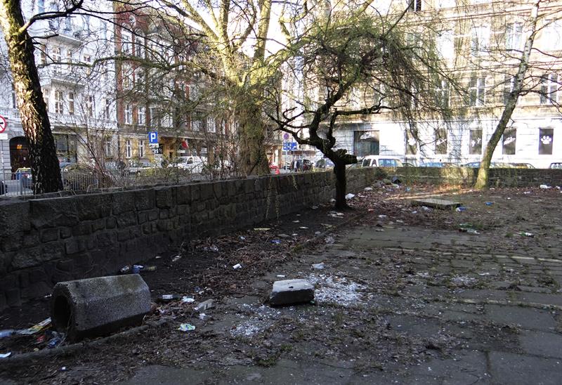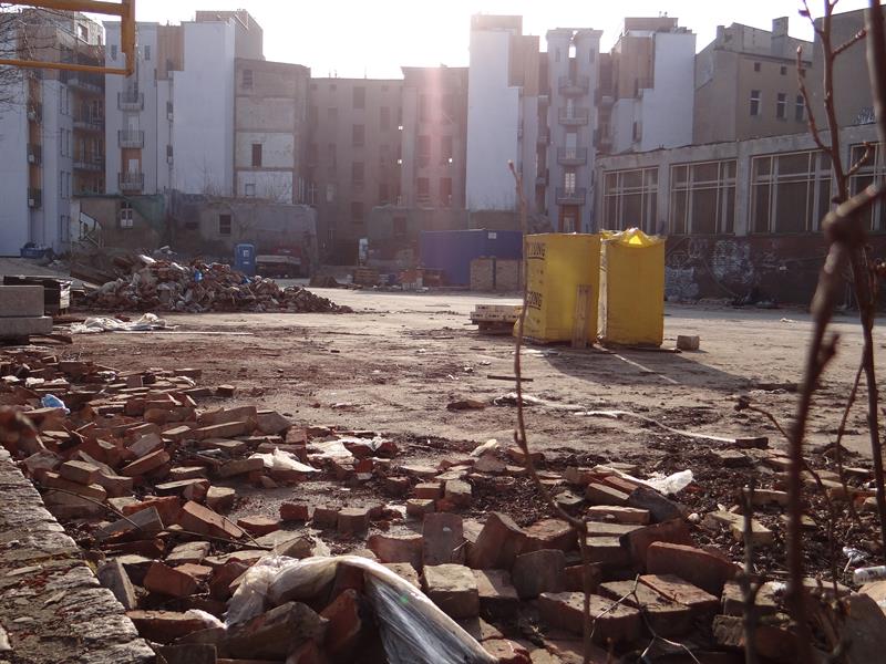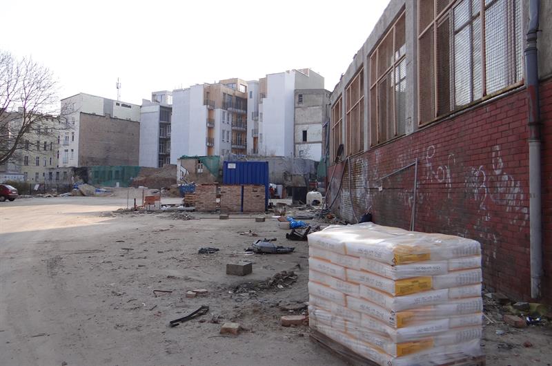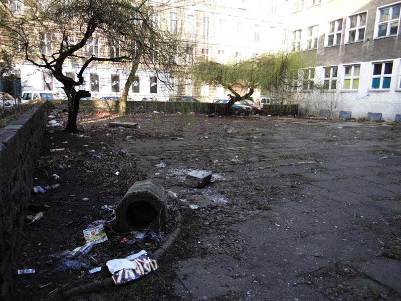Mimo zwinięcia z byłego boiska, znajdującego się od podwórza, zaplecza placu budowy przez prywatnego inwestora spółkę LCD, przebudowującą z mozołem cztery kamienice i przyległe do niej oficyny od sąsiedniej ul. Śląskiej, krajobraz w tym miejscu ten sam, czyli pobojowisko. Mimo że już w styczniu zgłaszaliśmy ów bałagan, sugerując prezesowi tejże spółki, że wypadałoby ten teren po sobie posprzątać. Jest kwiecień.