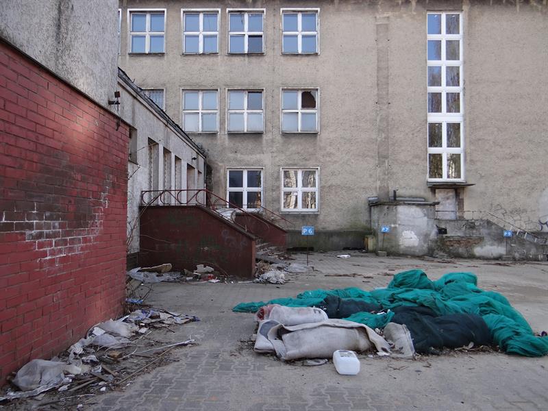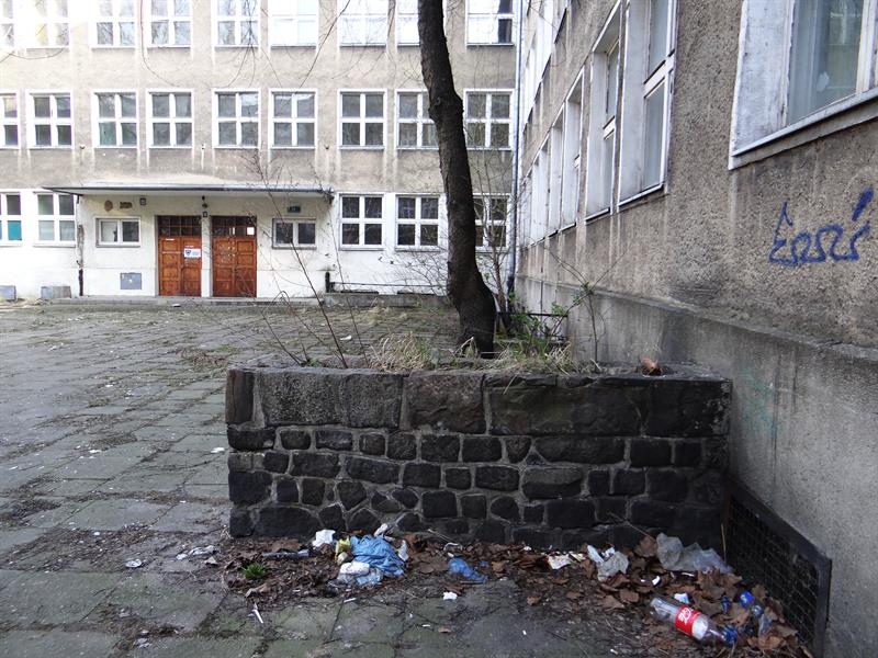 Odpady i resztki wcześniej zwiezionych i niewykorzystanych dotąd materiałów budowlanych, walająca się wszędzie cegła rozbiórkowa, odpady, flaszki, papierzyska - jeden wielki śmietnik od frontu, z boku i na tyłach. Tak właśnie prezentuje się otoczenie zlikwidowanej przed laty szkoły podstawowej przy ul. Obrońców Stalingradu 14 (ob. ul. Edmunda Bałuki) w Szczecinie w "osławionym" kwartale nr 21 śródmiejskiej zabudowy.